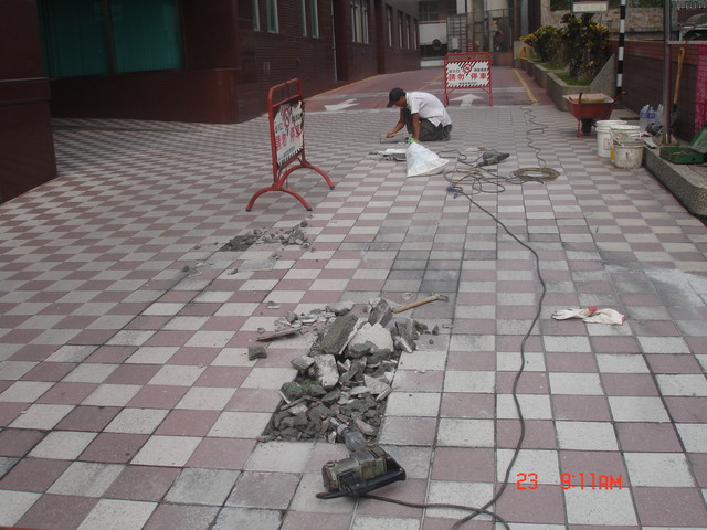 房屋整修 | 大小工程補(bǔ)修:車道入口處補(bǔ)地磚,將損壞的部位用切割機(jī)從瓷磚勾縫處切整齊,以免在打除時(shí)造成擴(kuò)大損壞,將施作在結(jié)構(gòu)體上的PU防水層剔除清潔乾淨(jìng),先涂上樹脂水泥膏(這是防水用的)再補(bǔ)上半干濕水泥砂刮平,抹上磁磚專用粘著劑,貼上石頭磚再填縫即可完成.